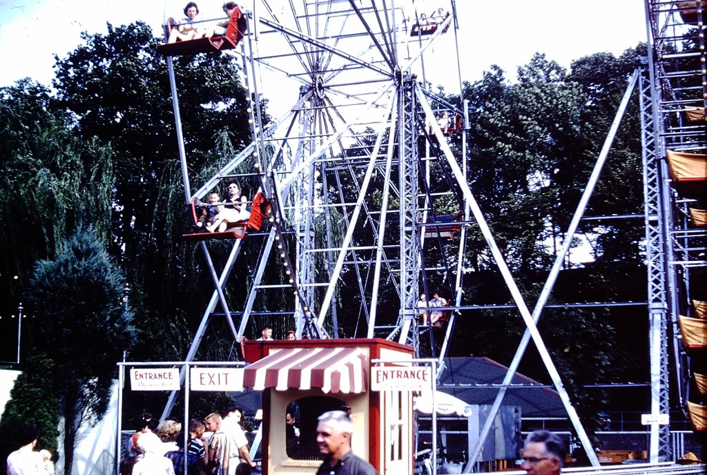 The view from the ride did not change much through the years it was in the park, since the Mill Chute, The Bug, Skooter, and Comet, all pre-date the Twin Ferris Wheels. In the picture below, from 1974, you can see some rides which were added tot he park in the intervening years – including Skyview (1966) and the Mini Comet (1974) – which can be seen in the distance.