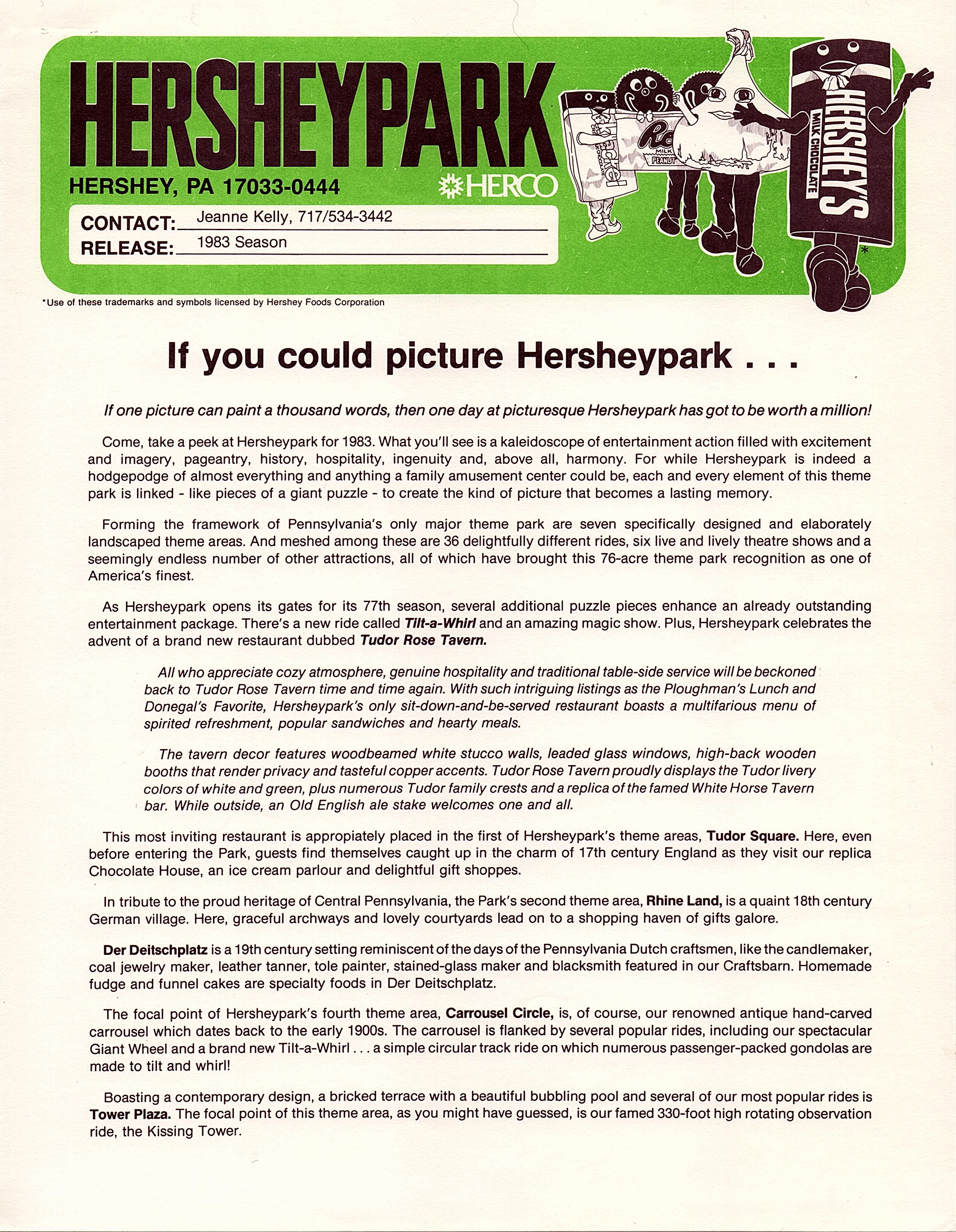 This can be seen no further than a description of Hersheypark and it’s theme areas from the 1983 press kit. A section titled “If you could picture Hersheypark…” lists all seven theme areas, and makes a reference to Spring Creek Hollow, the last such reference to the name of that area. (From 1984-1989, the name Spring Creek Hollow doesn’t exist – in 1990, the area is named Comet Hollow.)