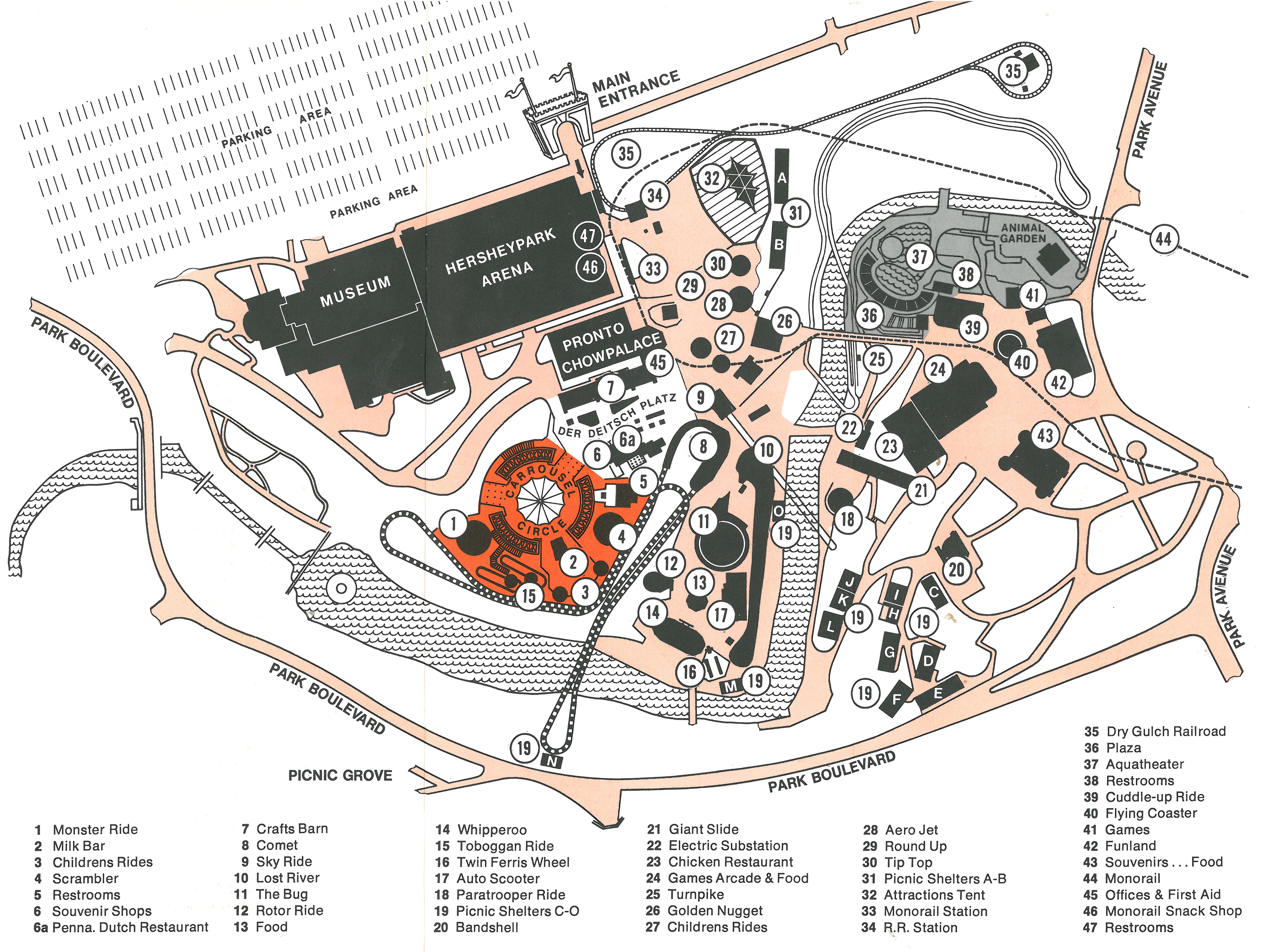 From 1975-1978, Hersheypark did not include a map in their rack brochure. The handouts at the park were simple double-sided printouts of entertainment schedules, and some general information about the park. The park did produce souvenir maps in 1975, 1977, and 1978.