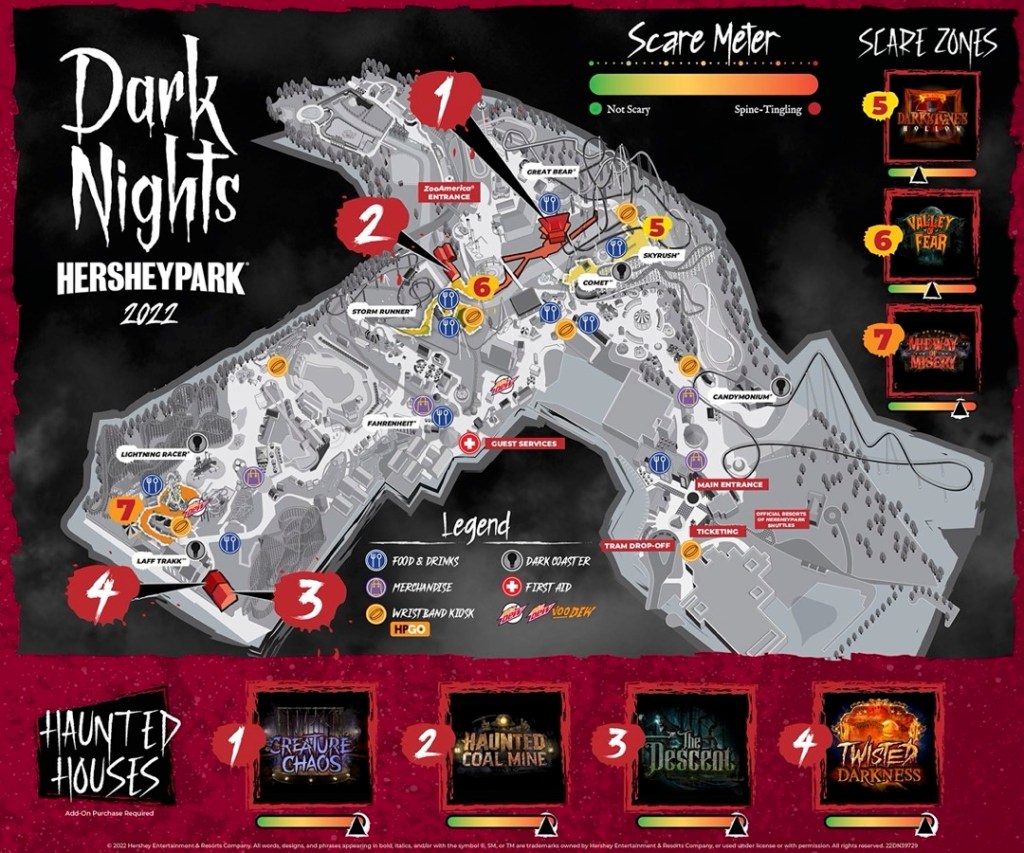 When the COVID-19 Pandemic postponed the start of the 2020 summer season, Hersheypark discontinued printing maps of the park. This continued through the 2021 and 2022 seasons. However, Hersheypark launched Dark Nights in 2022. For this event, they printed a map of the park with the Dark Nights scare zones and haunted houses labeled. Maps of Hersheypark can still be found on Hersheypark’s website and Hersheypark’s app.