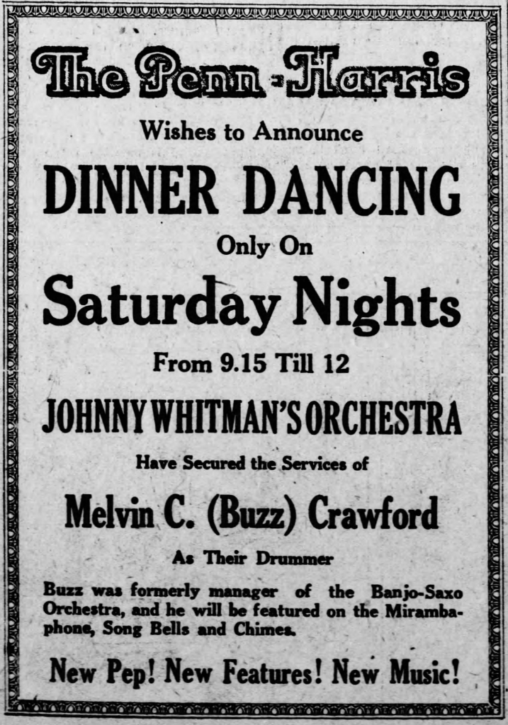 Crawford left the Orchestra in January 1927, joining Johnny Whitman’s Orchestra, which had been signed to play Saturday nights at the Penn-Harris in Harrisburg.
