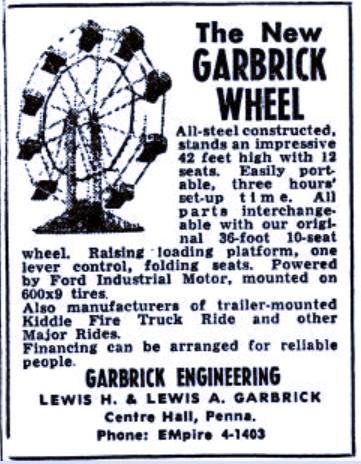 When he returned back to Centre Hall from his service, he and his father decided to make amusement rides. By 1949, their rides were being promoted at local fairs under the Garbrick Rides name.