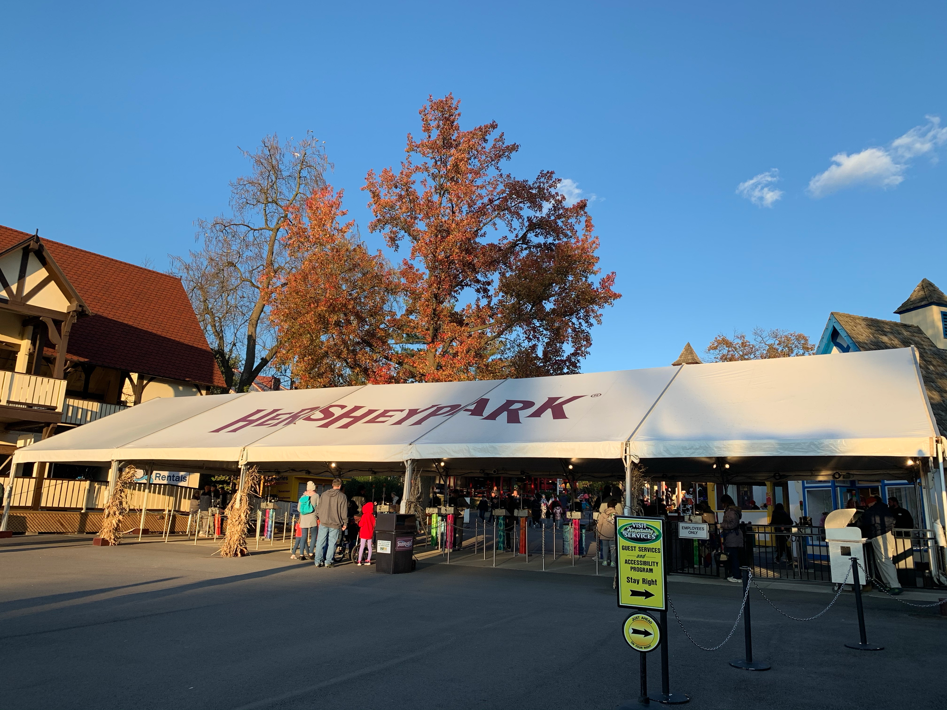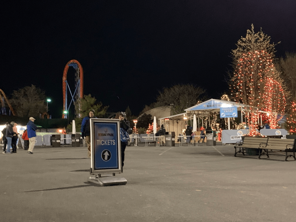 For Hersheypark’s 37th Christmas Candylane, the park relocated the temporary entrance from the future Hershey’s Chocolatetown, to Pioneer Frontier, in the center of the park. The entrance utilized Gate 6B. Tram Circle was relocated from it’s Hershey’s Chocolatetown location to a parking lot circle outside the temporary entrance area.