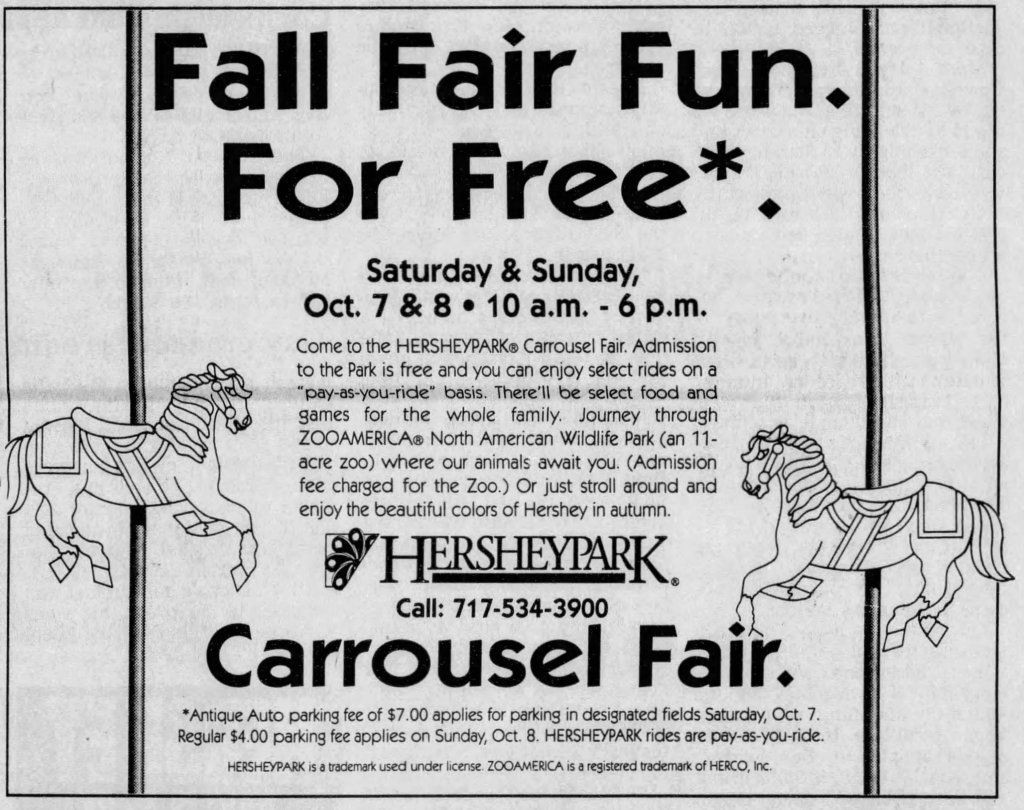 The Carrousel Fair was an event at Hersheypark that can trace its roots to the 1978 season. The event was last held in 1999. It started out as a promotional pay-as-you-ride event advertised as “October Days.” It extended the summer season. This extension allowed the park to operate during AACA’s Eastern Region Fall Swap Meet at Hersheypark.