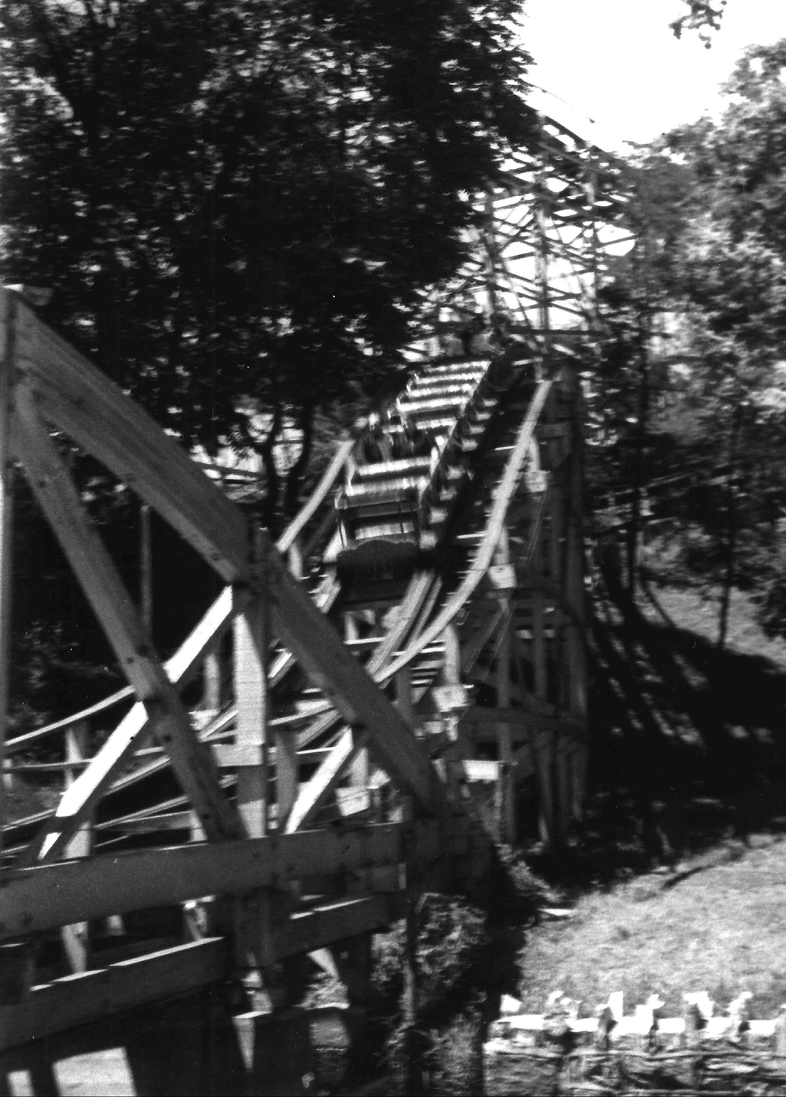 A black and white photograph of a wooden roller coaster track, with a steep incline surrounded by trees.